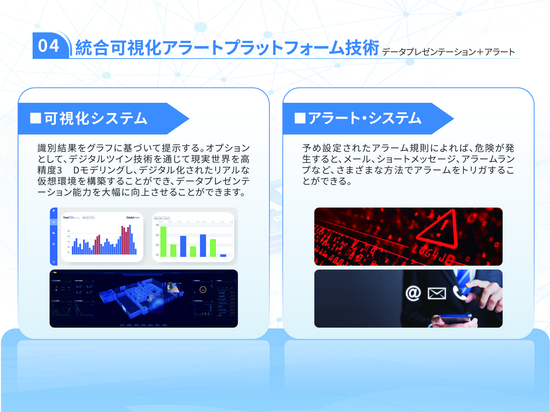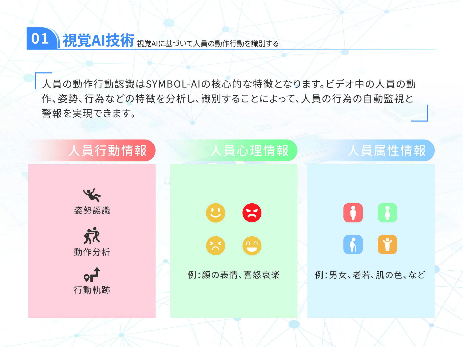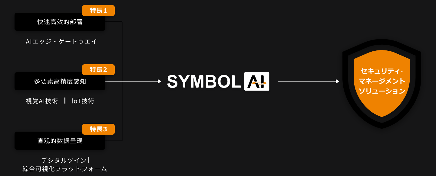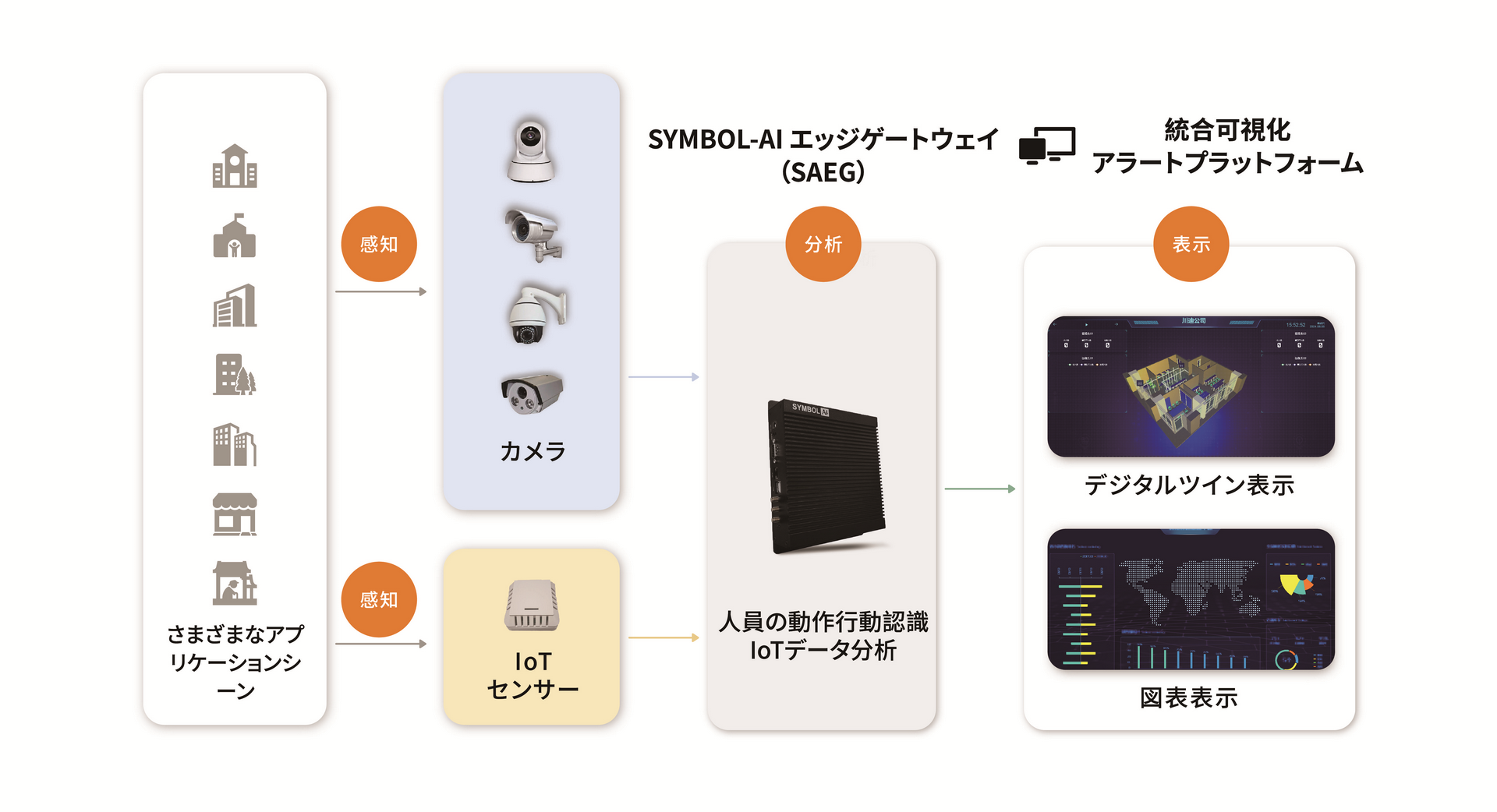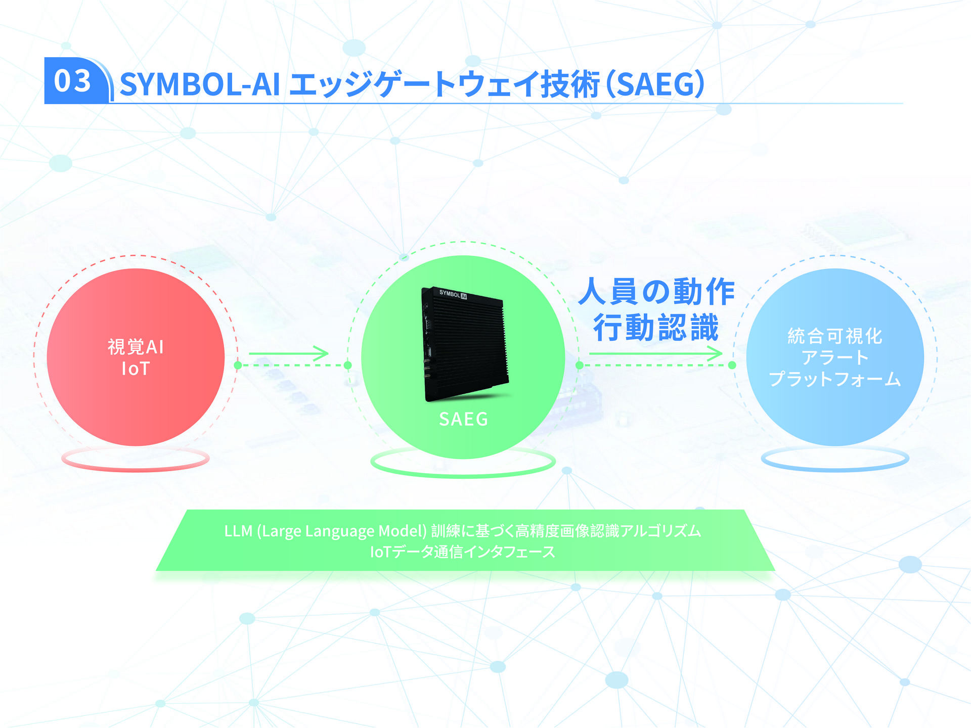 従来の AI ソリューションは、ある方面の問題を解決することに重点を置いていることが多いですが、SYMBOL-AIはシステム配置の角度に立って問題を考えています。視覚AIとIoT技術に基づいて、高精度な知覚を実現し、デジタルツインと統合可視化プラットフォーム技術を通じて知覚結果データを直感的に表示します。また、LLM(Large Language Model)を利用した訓練結果をSYMBOL-AIエッジ・ゲートウェイ(SAEG)に注入することで、迅速かつ効率的な導入を実現しました。