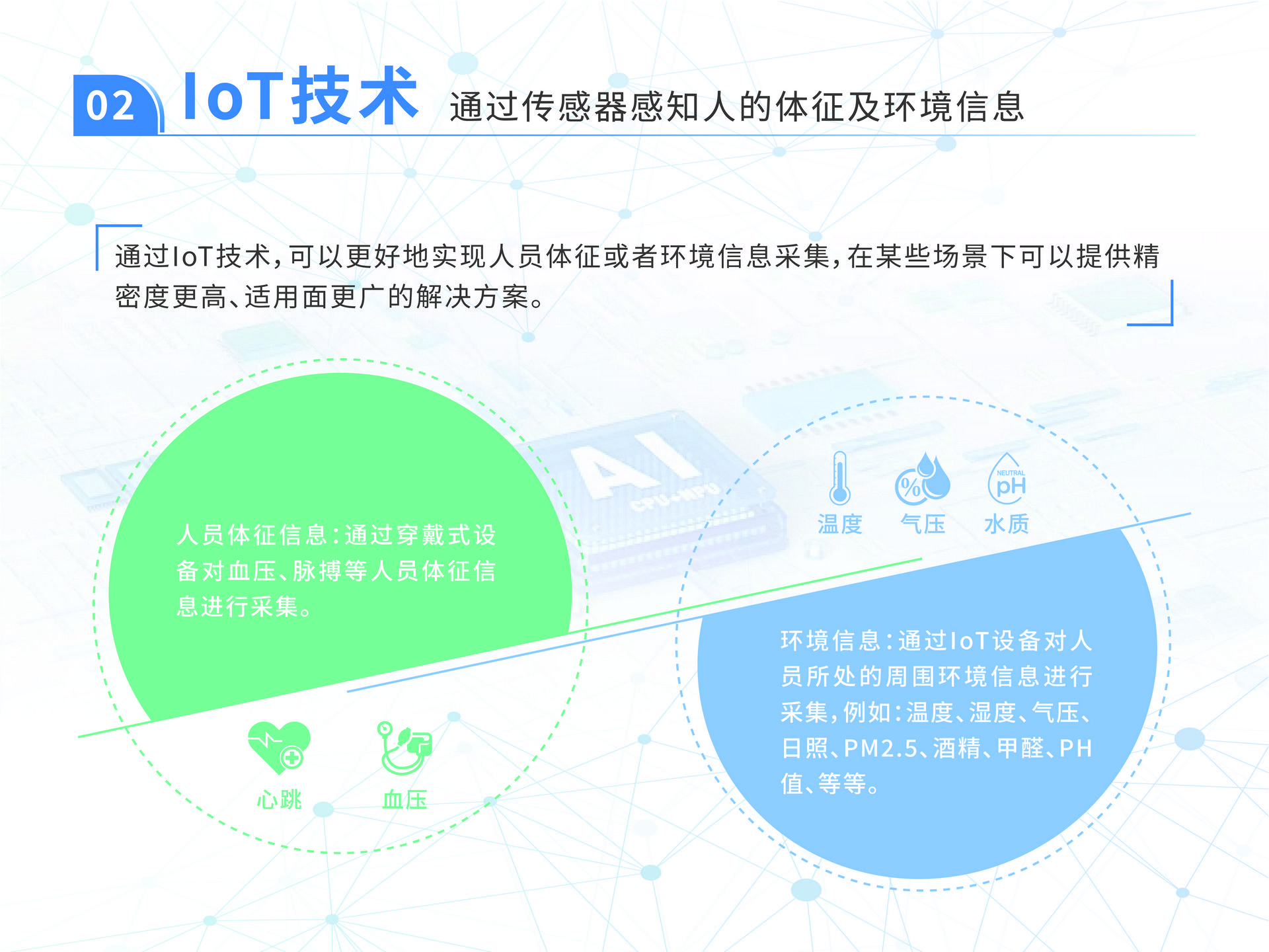 将视觉AI技术与物联网技术融合,从而更好地实现环境信息采集以及人员动作行为识别,在某些场景下可以提供精密度更高、适用面更广的解决方案。SAEG可以接入多种IoT设别,以对人的体征指标以及人所处环境的参数进行采集。主要设备列表如下: